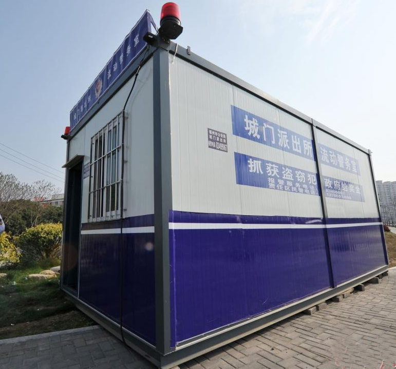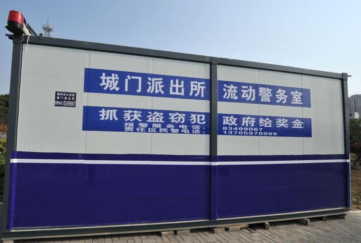 芳林昊天的集裝箱貨柜,經(jīng)過(guò)刷上藍(lán)白色,配上了兩個(gè)警燈,使集裝箱變成了流動(dòng)警務(wù)室,也被稱為“柜族”警務(wù)室,這種警務(wù)室一經(jīng)出售就受到了廣大客戶的喜愛(ài)。這些由集裝箱改造的警務(wù)室內(nèi)部面積18平方米,內(nèi)有辦公桌椅、水電等。